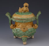 • 明素三彩贴狮首狮钮盖双耳三足陶香炉